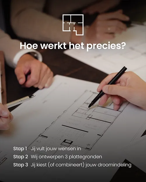 U geeft uw wensen door en ontvangt drie unieke indelingen die aansluiten bij uw stijl en leefbehoeften. Kies het ontwerp dat het beste past – of combineer elementen voor de optimale indeling.