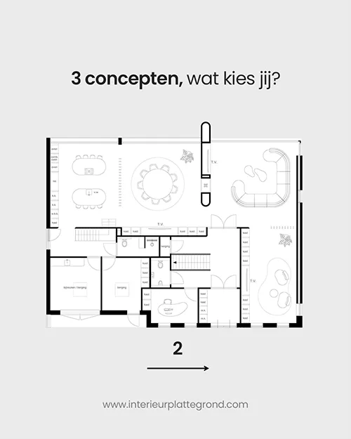 Soms weet je pas wat bij je past als je het voor je ziet. Daarom ontwerpen wij altijd 3 verschillende interieurplattegronden. Zo kun jij vergelijken, combineren of direct jouw favoriet kiezen.