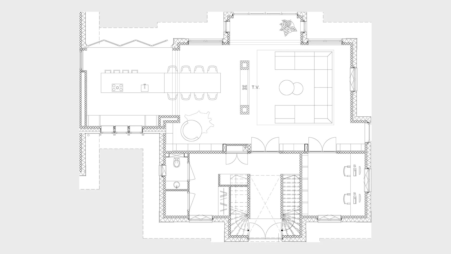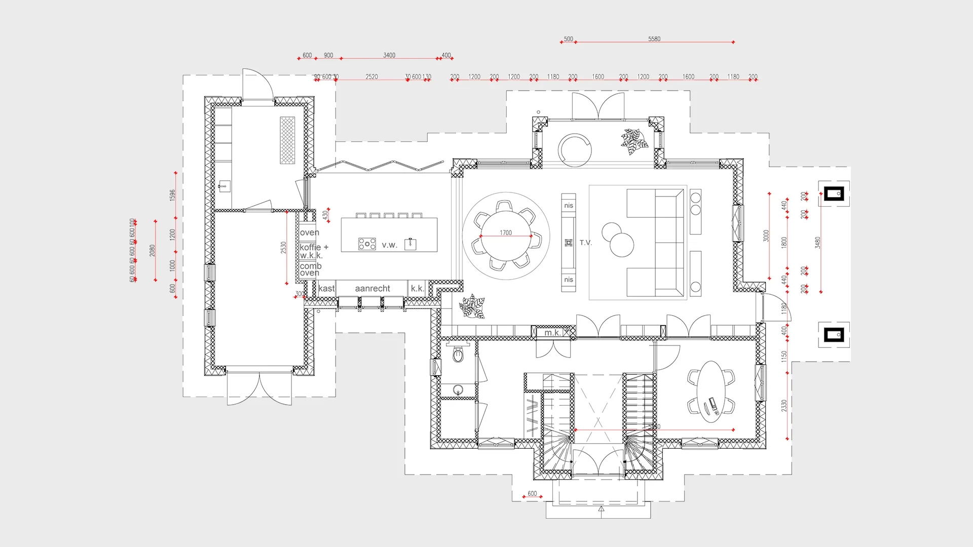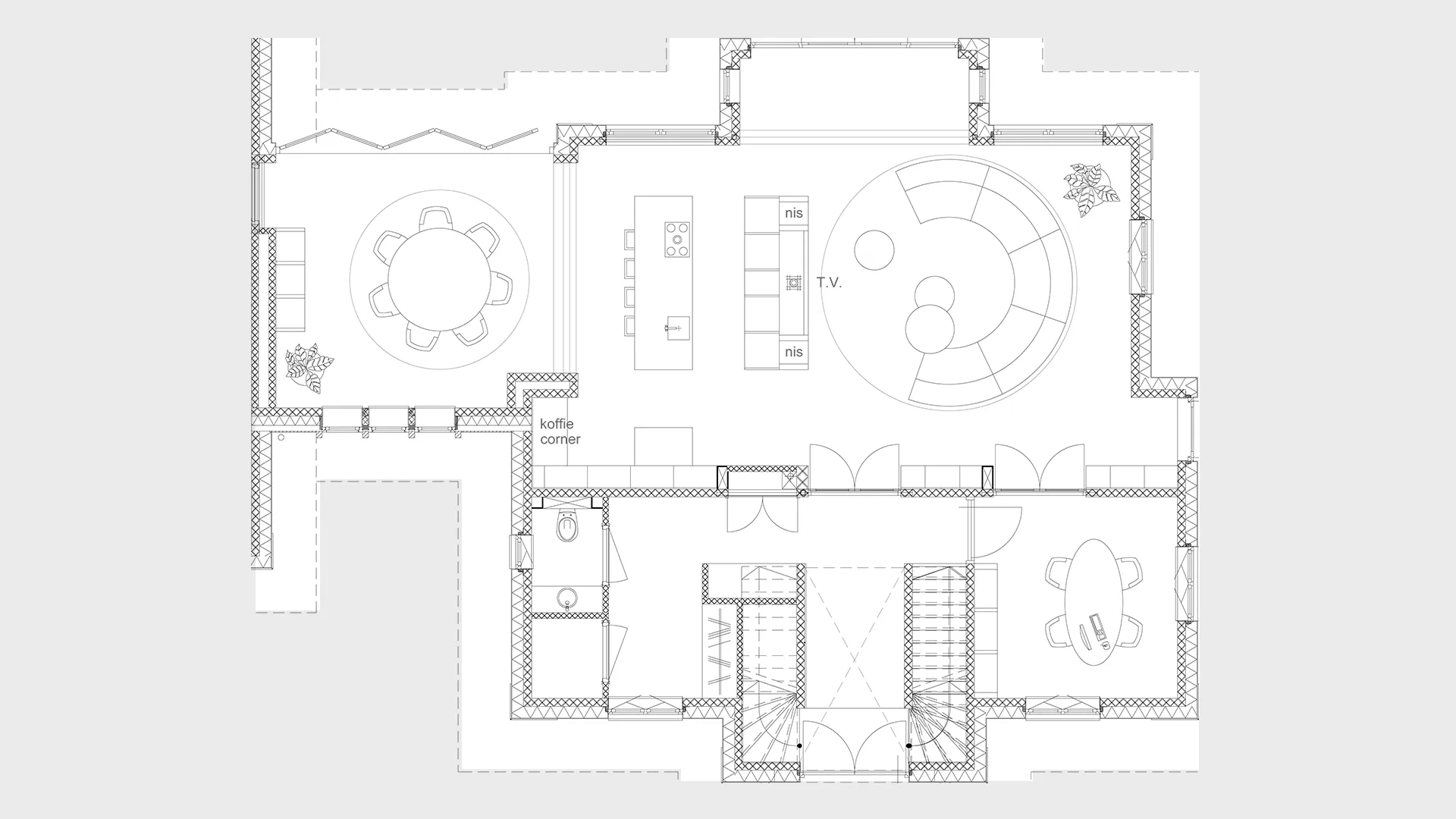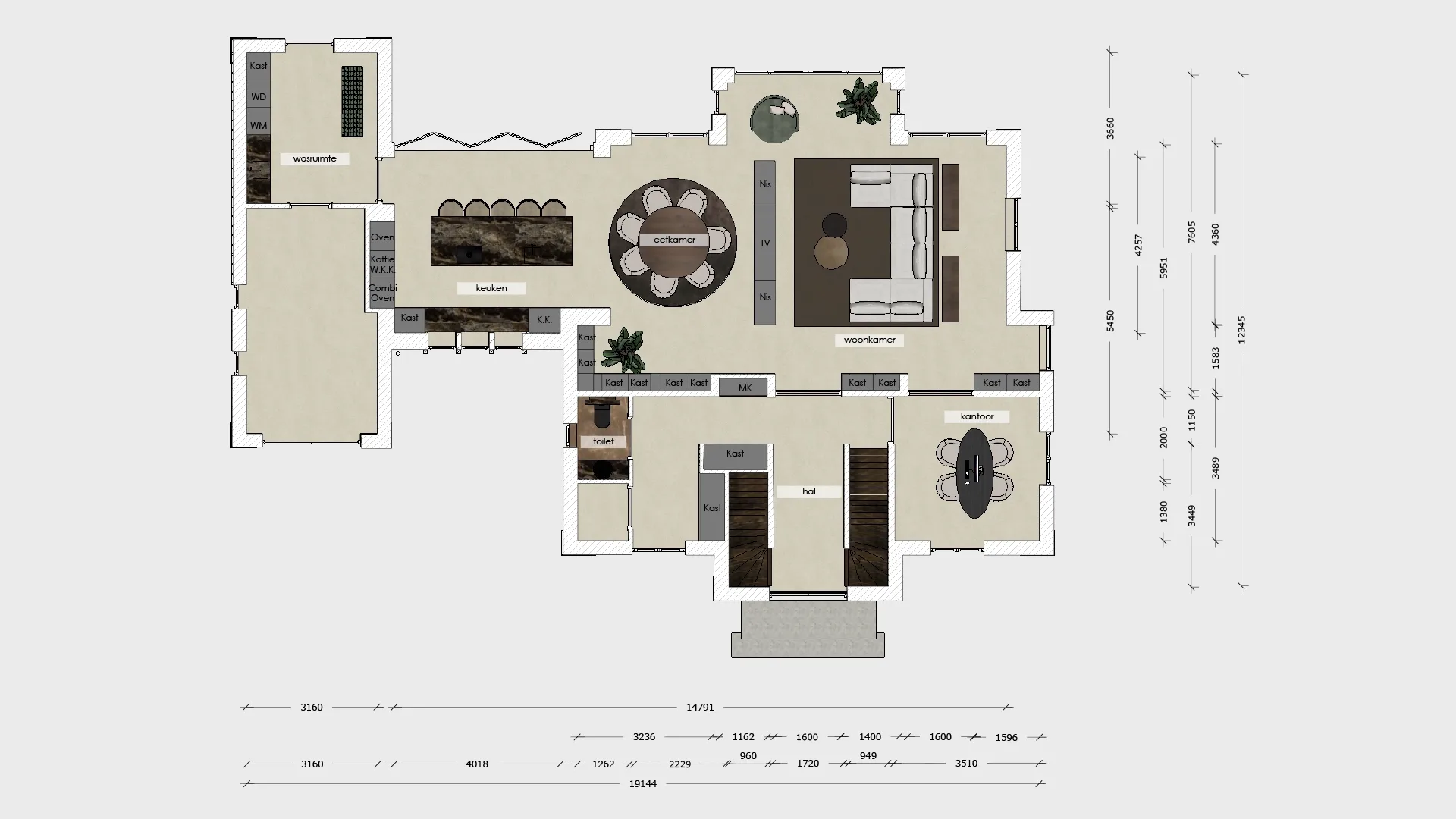 De dubbele trapopgang zorgt voor symmetrie en geeft direct een grande entree, dit stond al zo ingetekend door WNS architecten en hebben we in alle concepten gehandhaafd.